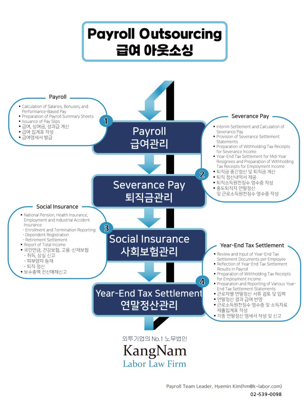 Notice Introduction to Payroll Management Services at KangNam Labor Law Firm: Monthly payroll management, severance pay management, social insurance management, and year-end tax settlement management.