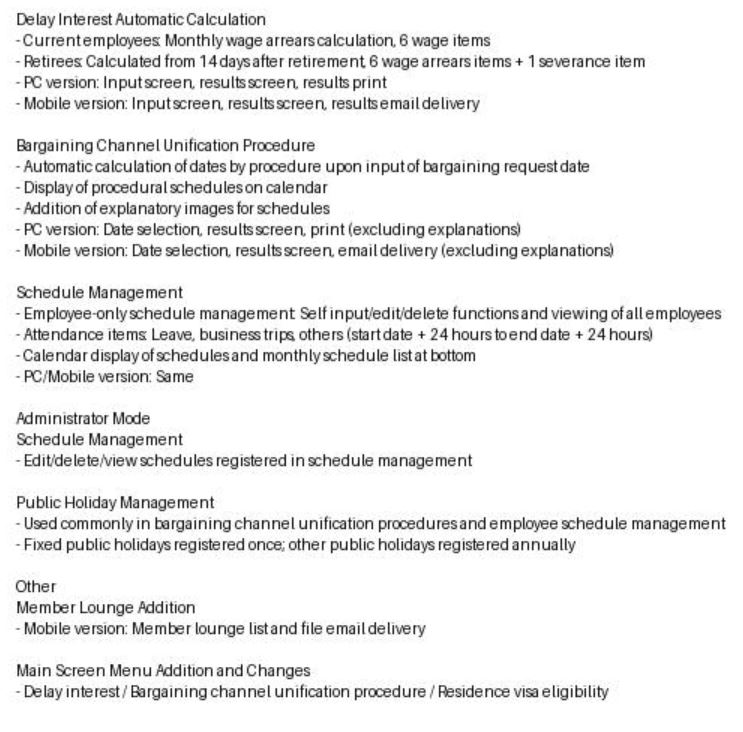 App development — an order was placed for the automation of calculation formulas, including automatic calculation of delay interest, automatic calculation of key dates for bargaining channel unification, creation of a KangNam Labor Law Firm schedule, and related app-based automated calculations.
