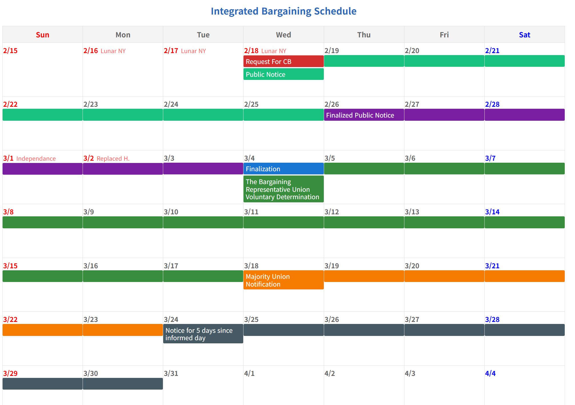 The app selects the participating labor union for bargaining and determines the representative bargaining union, presents the required public notice schedule, and displays the schedule in a calendar format as well.
