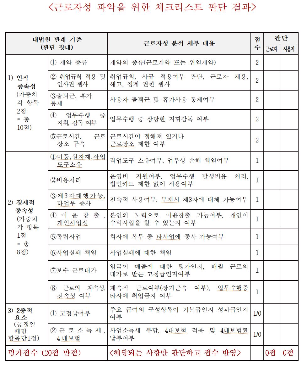 안녕하세요. 인사 담당자님, 근로자성 판단 자체점검 체크리스트에 찾아 주셔서 감사드립니다.