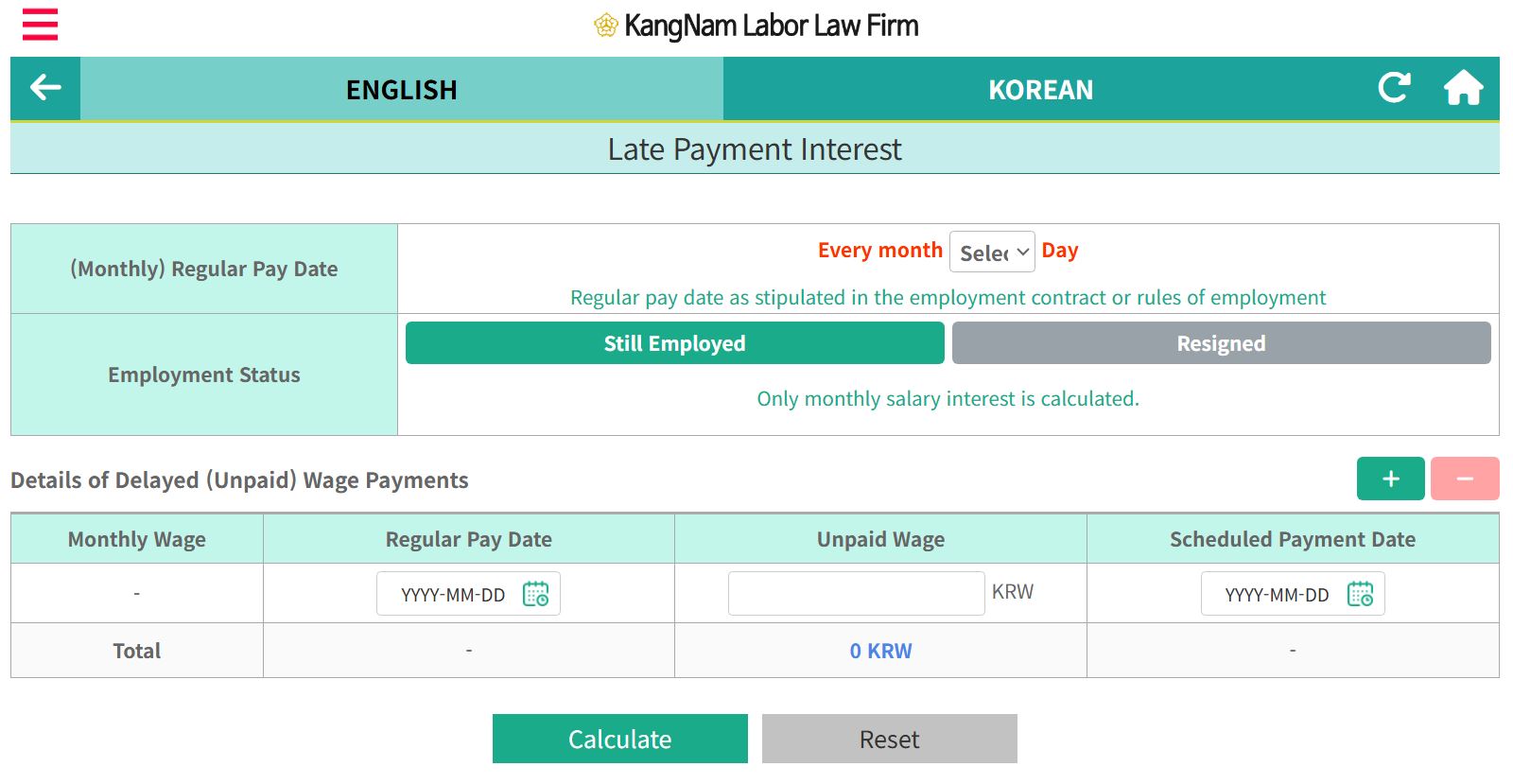 App Development Information – Automatic Calculation of Delay Interest: The app automatically calculates unpaid wages based on the statutory annual interest rate of 20%