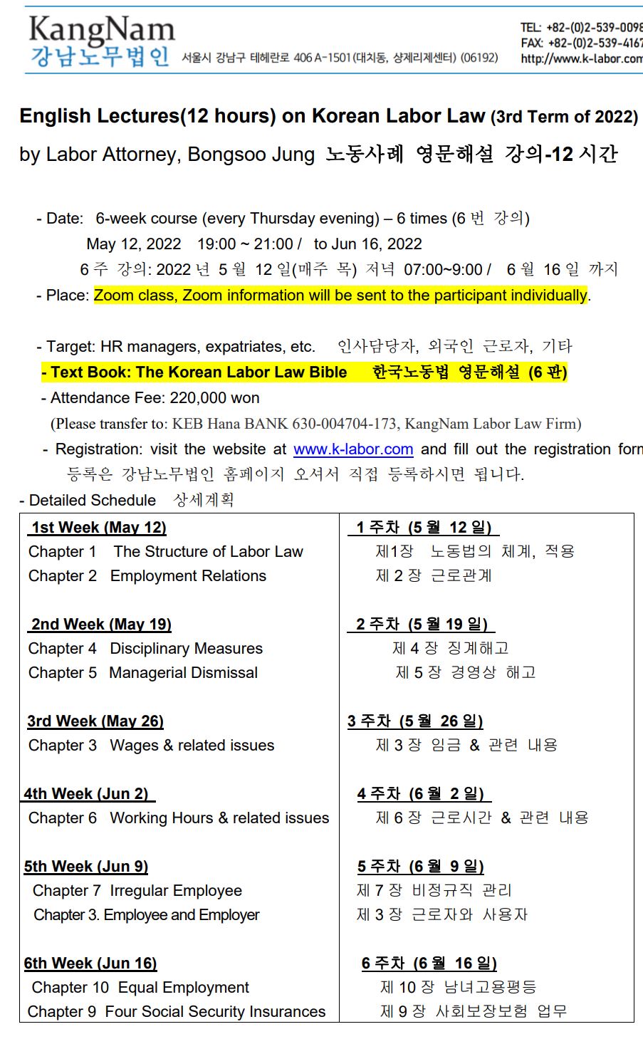 - Text Book: The Korean Labor Law Bible 한국노동법 영문해설 (6판)