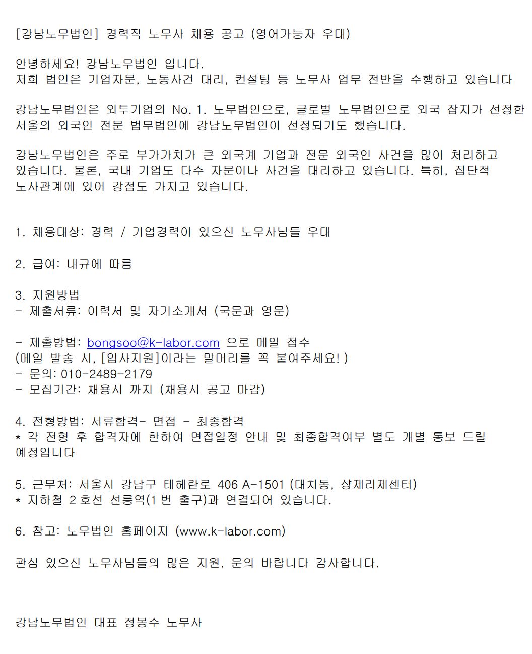 [강남노무법인] 경력직 노무사 채용 공고 (영어가능자 우대)
